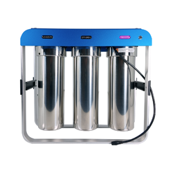 Fully equipped 4-stage RV filtration & purification system with UVC, stainless steel quick connect hoses, pressure regulator, 3-way splitter, and installed filters. Essential protection on the road.