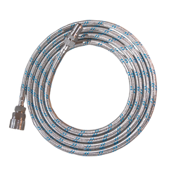 Durable 10-foot braided stainless steel hose with NSF-approved materials, quick connects, and adapters. Perfect for reliable and easy RV water connections.
